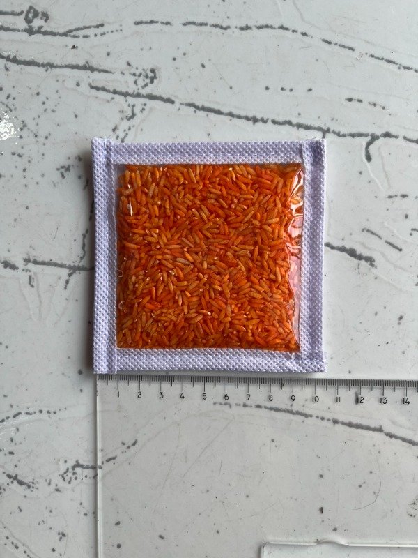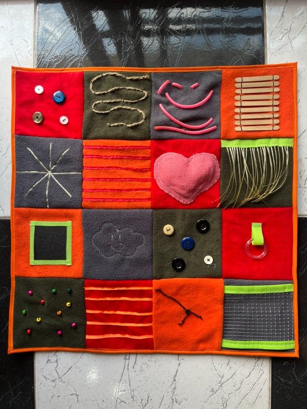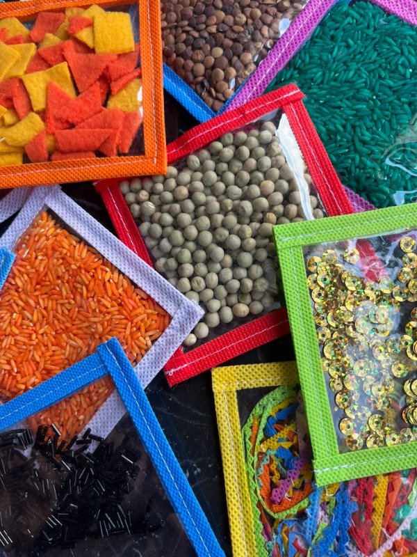 Alfombrita sensorial 60x60cm y 15 bolsitas sensoriales rellenas con variedad de elementos y colores.